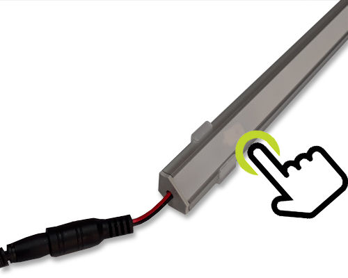 W rogu listwy wbudowano włącznik dotykowy. Oświetlenie włączane jest poprzez dotyk szybki w miejscu umiejscowienia włącznika, ponowny dotyk wyłącza oświetlenie. Przytrzymanie dłoni powoduje ściemnianie/rozjaśnianie lampy. |
