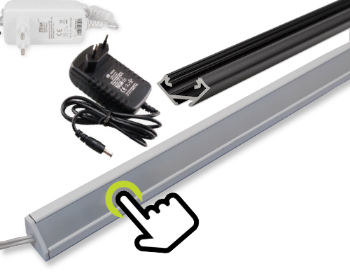 W rogu listwy wbudowano włącznik dotykowy. Oświetlenie włączane jest poprzez dotyk szybki w miejscu umiejscowienia włącznika, ponowny dotyk wyłącza oświetlenie. Przytrzymanie dłoni powoduje ściemnianie/rozjaśnianie lampy. |