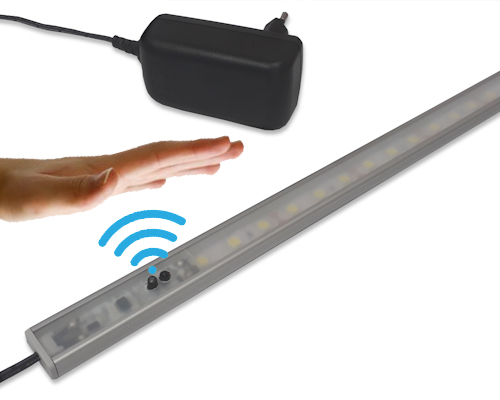 W rogu listwy wbudowano włącznik bezdotykowy. Oświetlenie włączane jest ruchem ręki pod czujnikiem ruchu, ponowny ruch ręką pod czujnikiem wyłącza oświetlenie. Przytrzymanie dłoni pod czujką powoduje ściemnianie/rozjaśnianie lampy. Sterowanie odbywa się poprzez ruch ręką w odległości do 5cm pod czujką, także wszelkie prace wykonywane na blacie kuchennym w pobliżu włącznika nie będą miały wpływu na działanie lampy. |