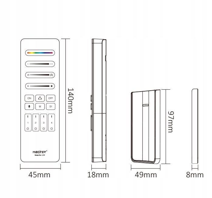 Na pilocie Mi-Light C10 znajduje się aż 14 przycisków oraz 4 suwaki, które oferują pełną kontrolę nad oświetleniem cyfrowym. Umożliwiają wybór dynamicznych programów świecenia, dowolną zmianę koloru animacji i indywidualne sterowanie aż 4 strefami oświetlenia. Pilot Mi-Light C10 jest również niezbędny do wstępnej konfiguracji podłączonej długości taśmy LED i ilości animowanych pikseli.
