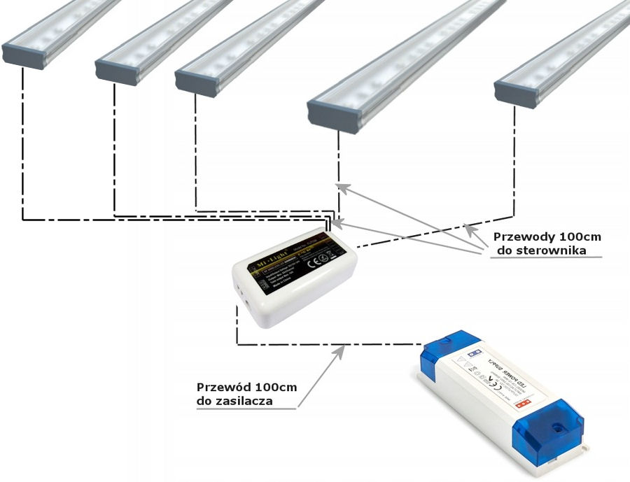 W profilu aluminiowym umieścimy taśmę LED, na profil założymy wybraną przez Państwa przesłonę/szybkę (mleczną lub bezbarwną), końce profilu będą zaślepione przez zaślepki końcowe a z jednej strony zostaną wypuszczone przewody. Przewody te zostaną przykręcone do sterownika a sam sterownika zostanie już przez nas zaprogramowany z pilotem. Ze sterownika wypuścimy metr przewodu umożliwiając podłączenie go do zasilacza, który znajduje się w zestawie !