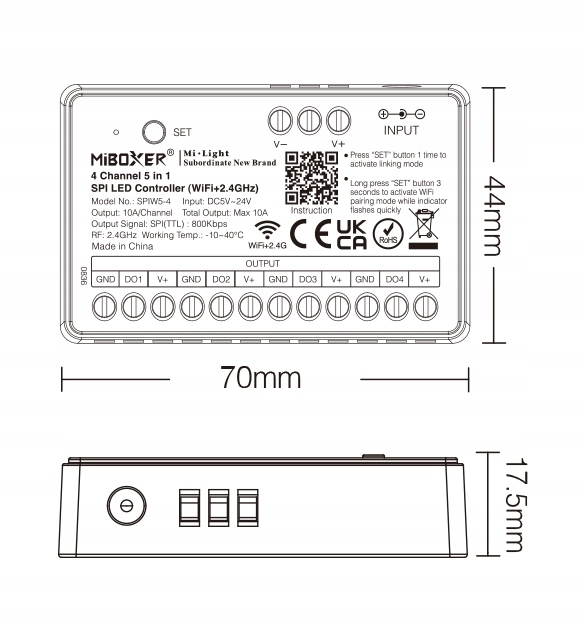 Sterownik MiBoxer SPIW5-4 to zaawansowane urządzenie przeznaczone do cyfrowych taśm LED SPI, łączące technologię WiFi i 2.4GHz RF. Umożliwia sterowanie oświetleniem LED za pomocą aplikacji Tuya Smart / Smart Life oraz pilotów MiBoxer. Dzięki temu pozwala na pełną personalizację efektów świetlnych od prostego oświetlenia białego po wielokolorowe dynamiczne animacje.