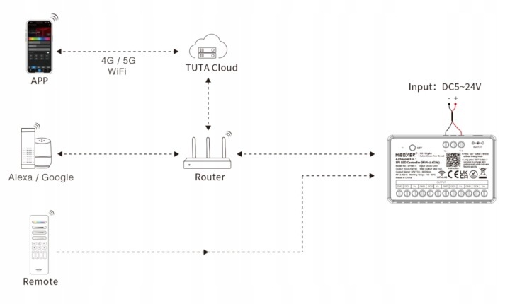 - Sterownik 5w1: obsługuje Single Color / CCT / RGB / RGBW / RGBCCT taśmy SPI.